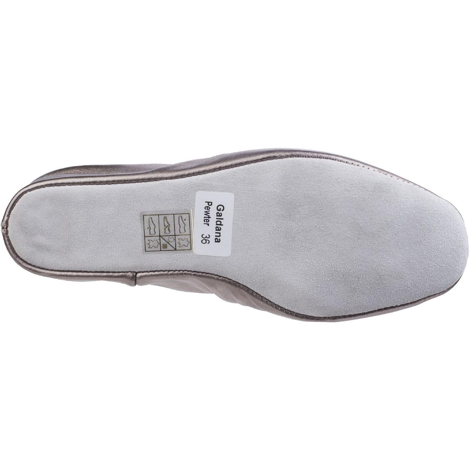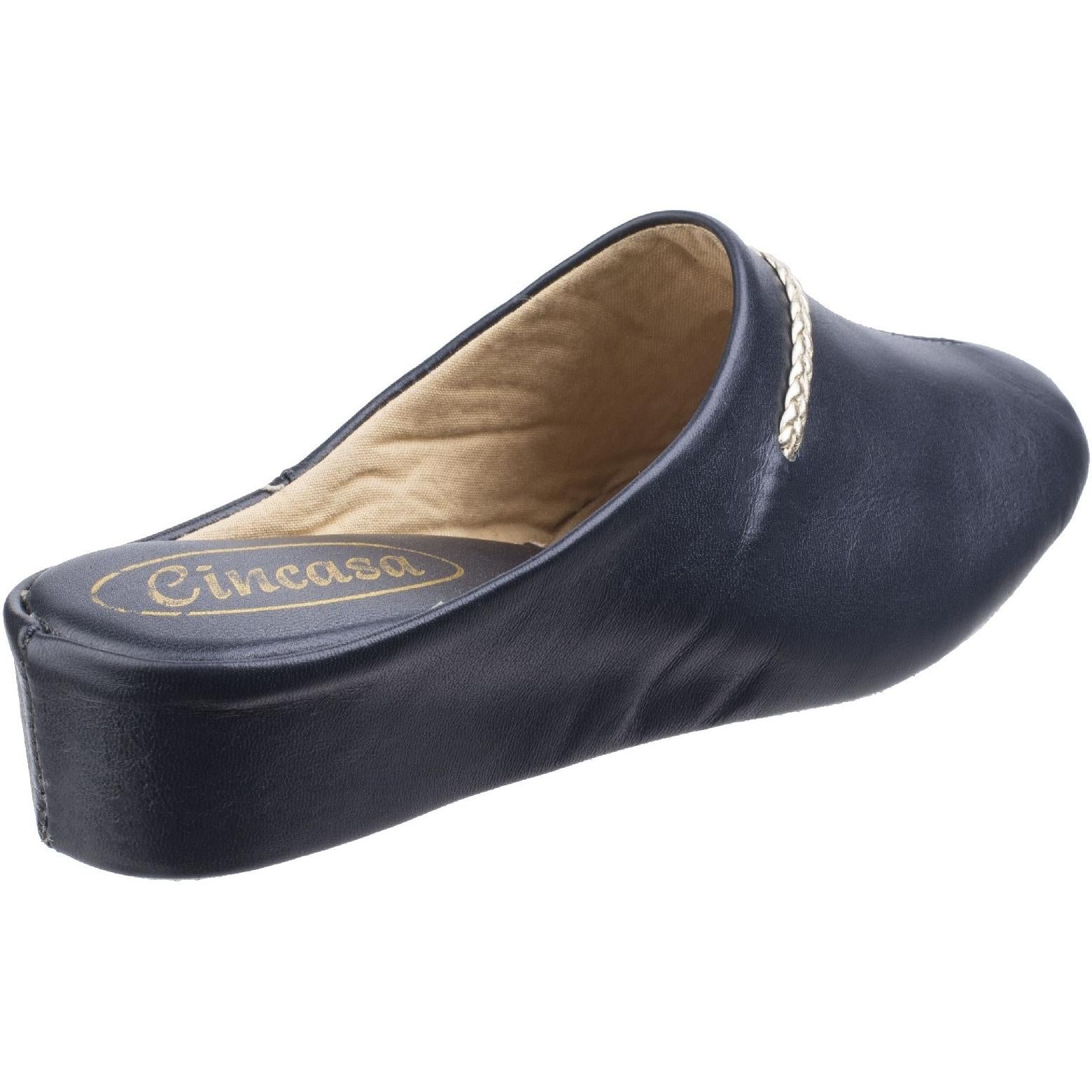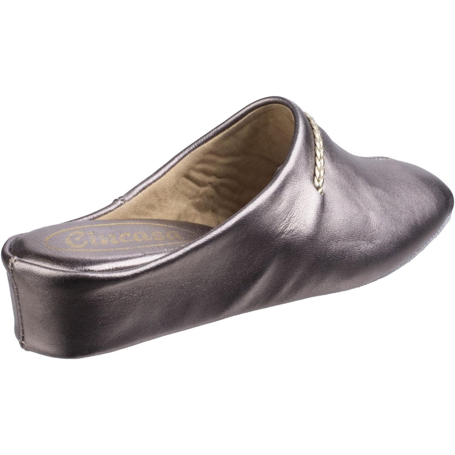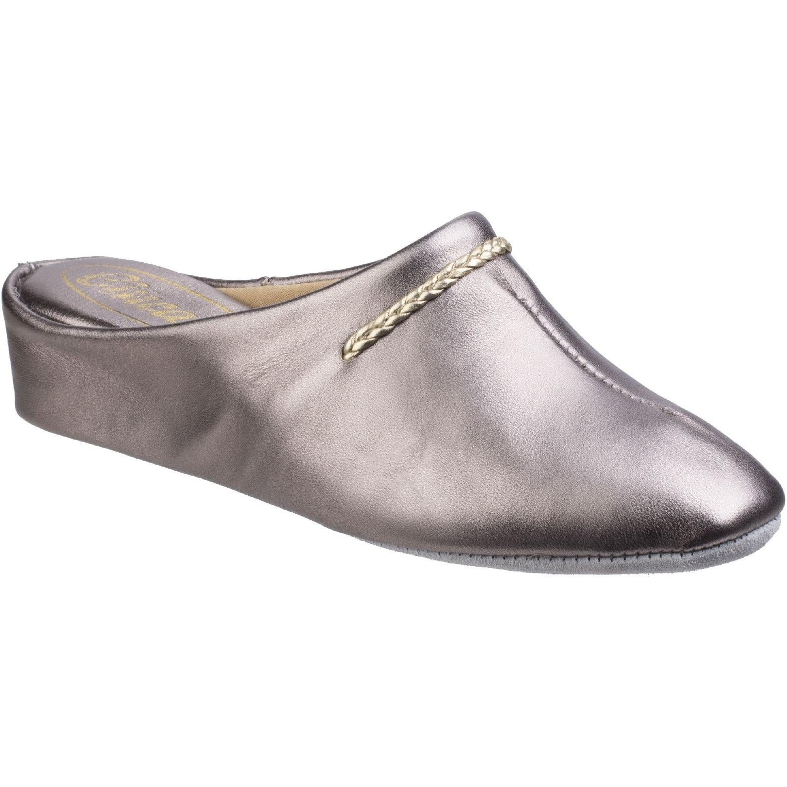 Traditional leather house shoes from Cincasa. This luxury womens mule slipper is crafted with a supple metallic leather upper with vintage designed leather soled base with subtle wedge.