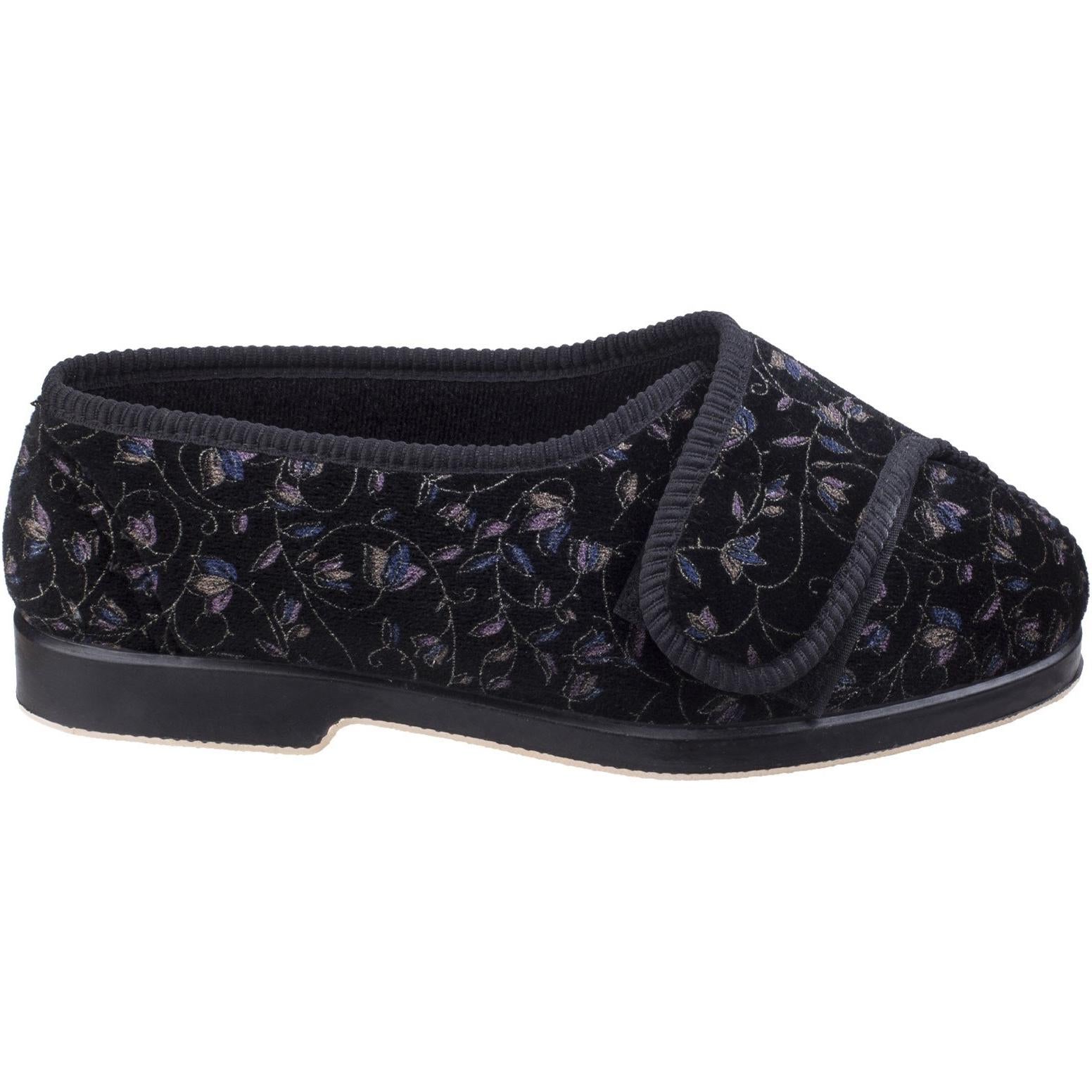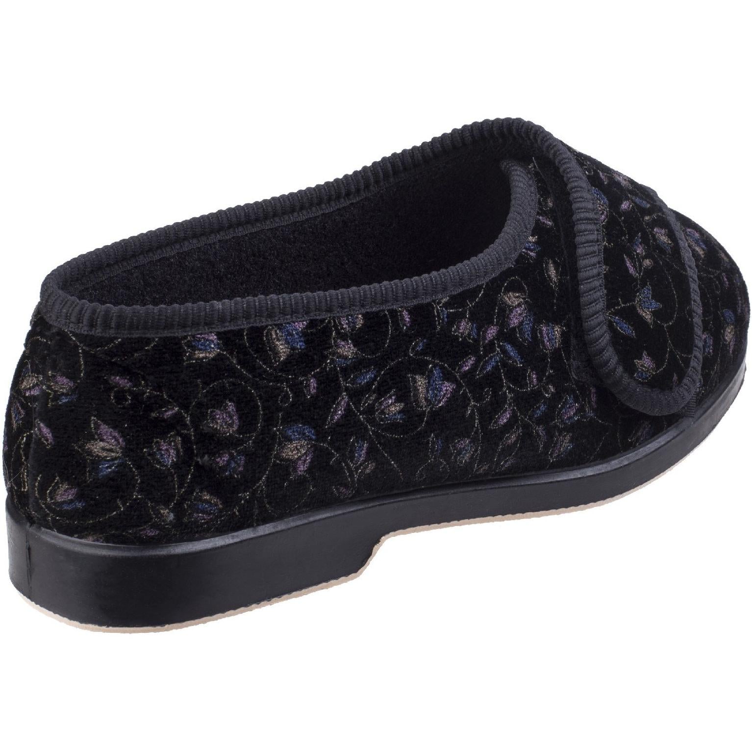 GBS Nola extra wide fit ladies slipper. Easy to slip into with touch fastening strap and comfortable, soft fabric upper. Vulcanised sponge rubber insole for comfort and hard outer sole.