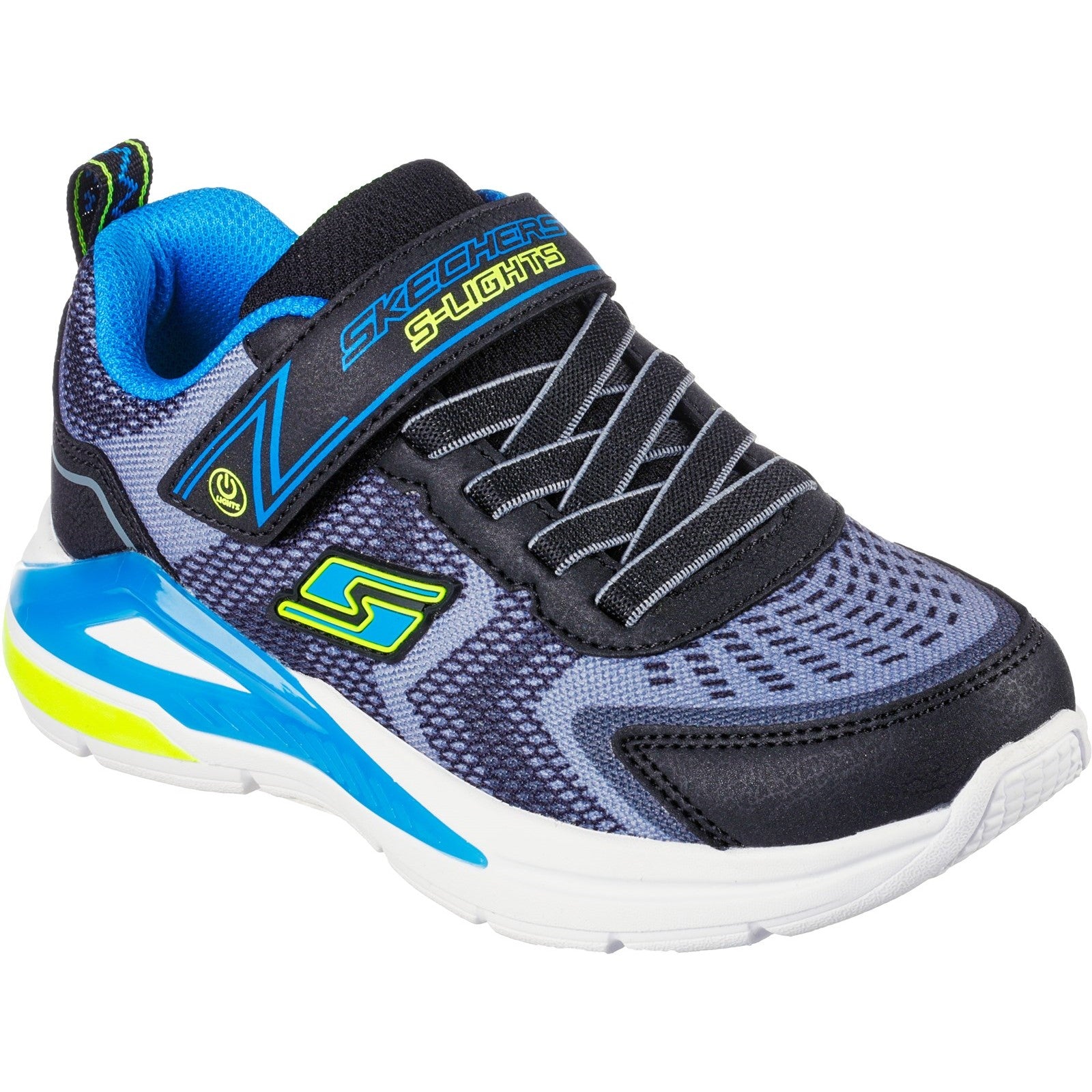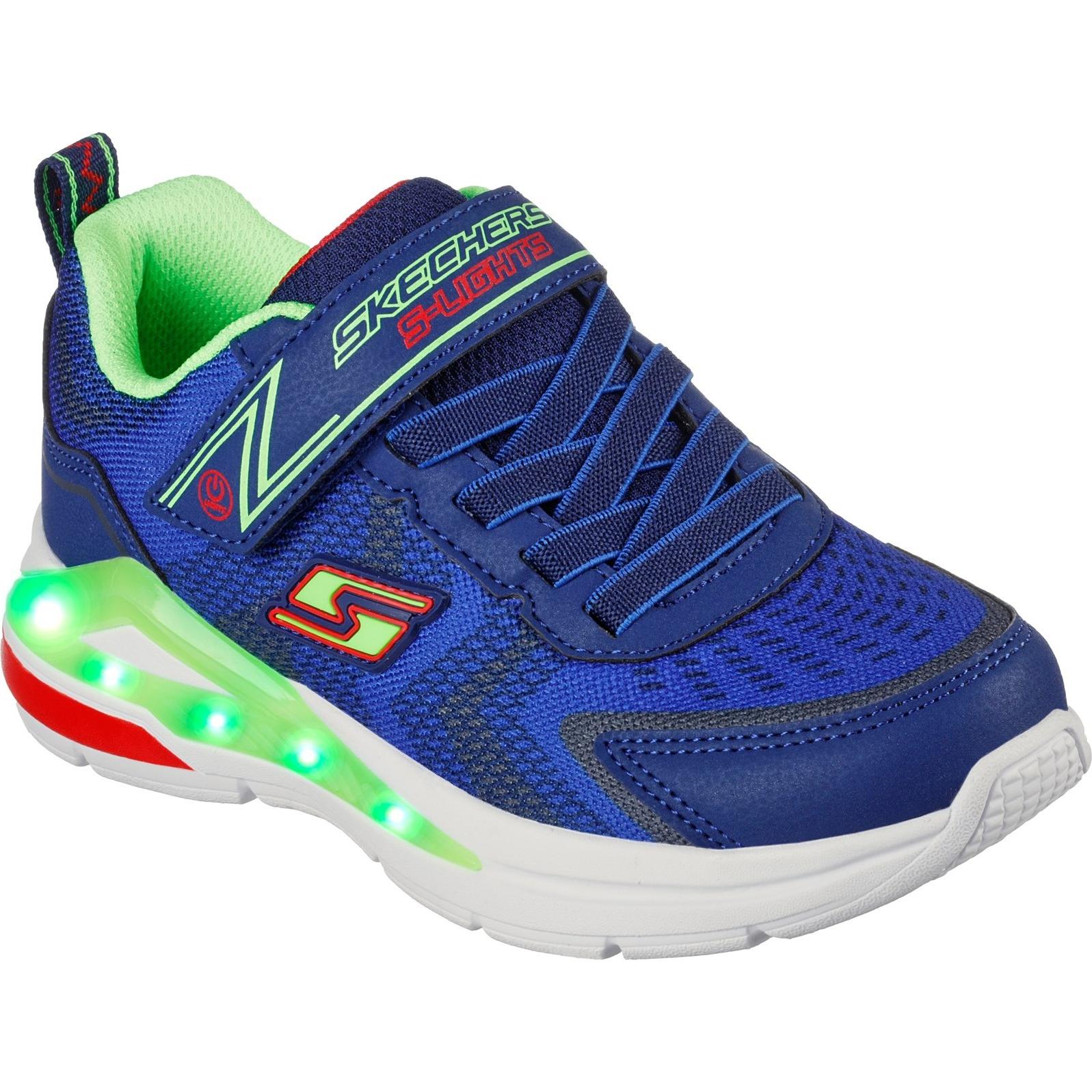 Light-up the fun in a quick flash with Skechers S-Lights: Tri-Namics. This lightweight sporty design features a mesh and synthetic upper with stretch laces and a light-up midsole.